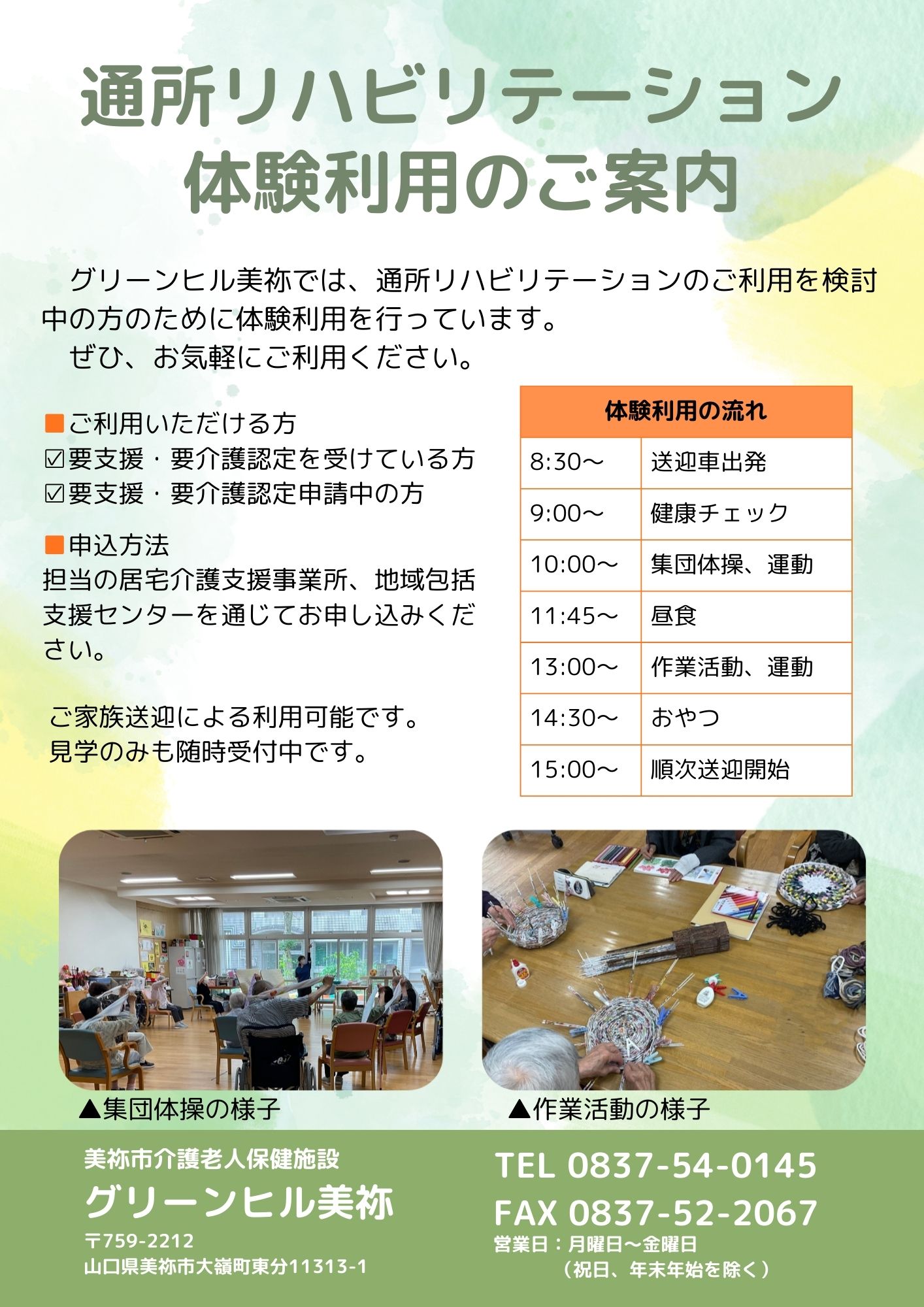 グリーンヒル美祢では、通所リハビリテーションの体験利用を行っています。