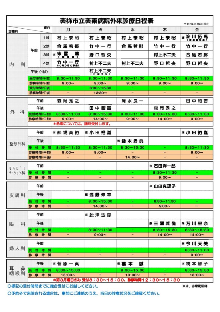 受付時間、診察時間は診療科や曜日によって異なりますので、「美東病院外来診療日程表」でご確認ください。